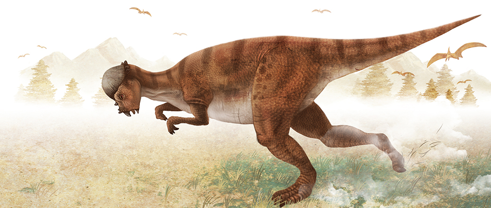 懷俄明腫頭龍在其腦袋上有一個大大的厚頭蓋骨,出奇地腫厚,形似圓屋頂,頭骨的高度可達(dá)25厘米,而且突出部分是實心的。科學(xué)家沒有確定此圓屋頂是否用于用頭撞(人),或是否有什么撞擊能傷害到恐龍。