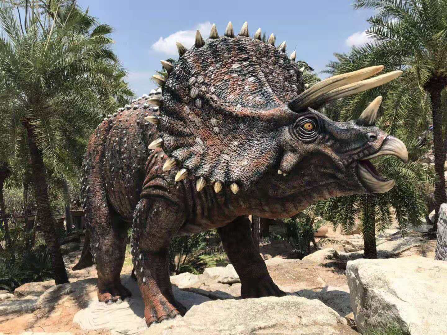 4. 野牛龍(愛氏角龍)野牛龍生活在白堊紀(jì)晚期,大約6 米長、1米高,頭部有三只大角,脖子上有一個大頸盾,邊緣有齒狀骨質(zhì)突起。它是由山普森(Sampson)在1994年發(fā)現(xiàn)的三個頭骨化石命名的。像其它角龍一樣,它在獸群中穿行,有牙齒,能咀嚼最硬的植物.
