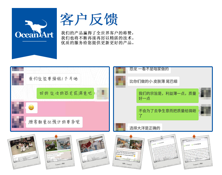 備注:我們注重展覽和產(chǎn)品本身的文化底蘊及科技含量,并且關(guān)注產(chǎn)品與觀眾的互動性、娛樂性和參與性,因此,我們先后推出了騎乘恐龍、打斗恐龍組、生蛋龍、蓋章恐龍、恐龍衣服等一系列,科技含量高,故事情節(jié)豐富,娛樂參與性極強的產(chǎn)品,深受廣大消費者的青睞。除了產(chǎn)品的研發(fā)與制造,公司的營銷核心是一套成熟的、創(chuàng)新性的展覽理念,并在海內(nèi)外都取得了廣泛的成功!