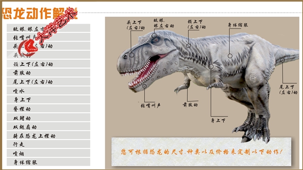 4. 采用優(yōu)質(zhì)電機(jī)和電器元件控制恐龍展品動作,達(dá)到經(jīng)久耐用動作靈活協(xié)調(diào)的效果。
